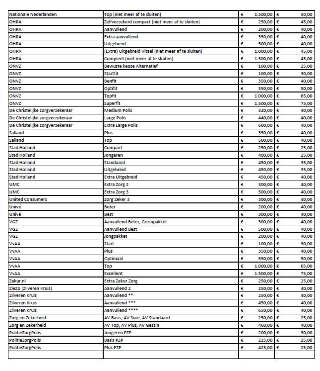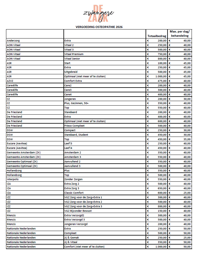 Of je nu overweegt een zwangerschapscursus te volgen, of benieuwd bent naar de vergoeding voor osteopathie – het is fijn als je in één oogopslag ziet welke verzekeraars een deel van de kosten op zich nemen.