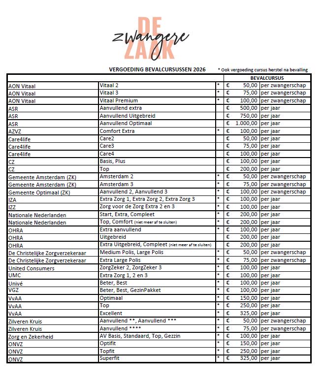 Dit jaar heeft Gerdine ook uitgezocht welke verzekeraars bijdragen aan het Post Partum Programma. Dat is vermeldt met een *